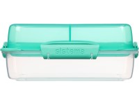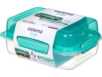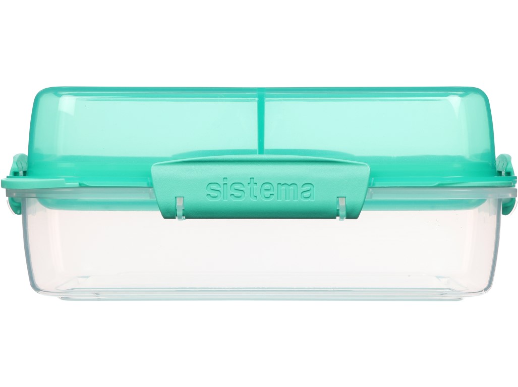 Uzsonnás doboz praktikus belső elrendezéssel. A doboz két részből áll (alsó és felső), amelyek közül az egyik fix válaszfallal két részre van osztva. Az alsó és a felső részt egy kivehető válaszfal választja el egymástól, amely tálcaként vagy csészealjként is használható. A kivehető válaszfal kerülete mentén tömítés található, amely megbízhatóan védi a doboz alsó és felső részét. A tartalom elfogyasztása után a felső (színes) rész beilleszthető az alsó részbe, és Sistema pattintókapcsokkal rögzíthető. Ezzel helyet takaríthat meg hátizsákjában vagy táskájában. Előnyök: Két rekesz az élelmiszerek szétválasztására A felső rész a tartalom elfogyasztása után az alsó részbe helyezhető Egymásra rakható, tartós műanyag